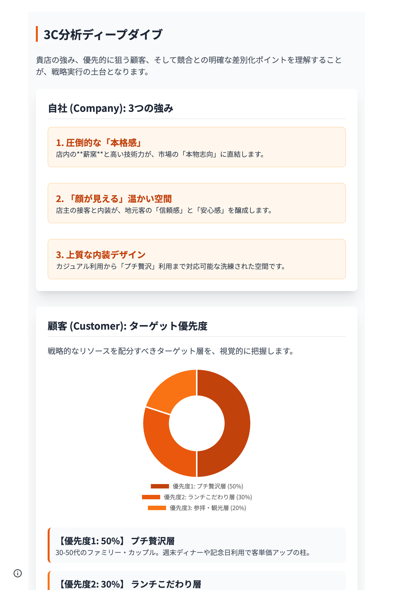 無料レポートを通じて、まずは自身の事業の見える化を体感して頂き、戦略やマーケティングの具体的な一歩目をご支援したいと考えております。